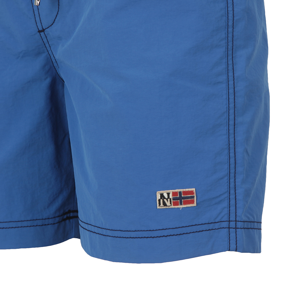 Ανδρικό Napapijri Villa Solid Swim Short, κατασκευασμένο από ύφασμα 100% πολυαμίδιο. Περιλαμβάνει μια ελαστική ζώνη μέσης που κλείνει με κορδόνι περίσφιξης, με επένδυση από διχτυωτό πλέγμα και πίσω τσέπη που κλείνει με velcro. Διαθέτει κεντημένο λογότυπο Napapijri.